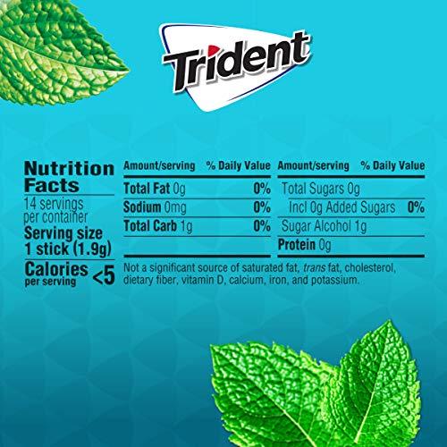 Trident Mint Bliss Sugar Free Gum is a delicious way to freshen breath and protect your teeth. Trident sugar free mint gum is like a minty fresh road that only has green lights and leads to a carnival! With 30% fewer calories than sugared gum, Trident gum is sweetened with xylitol, a naturally occurring sugar alcohol. The ADA Council on Scientific Affairs found that the physical of chewing Trident sugarless gum for 20 minutes after eating stimulates saliva flow which helps to prevent cavities by reducing plaque acids and strengthening teeth. Bulk gum packs give you plenty to stock your home or workplace, and each individual pack of gum is designed so the sugar free mint gum stays inside, making it easy to toss in your car, backpack or desk drawer. These sticks of mint gum are individually wrapped for extra freshness. Whenever you need a long lasting chew, choose Trident Sugar Free Chewing Gum.