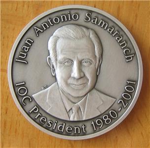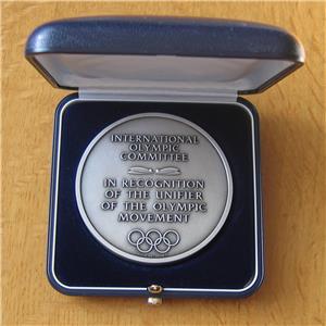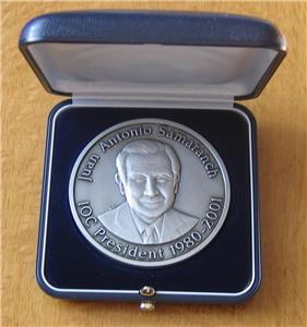 An Olympic medal dating from 2001 or thereabouts and commemorating the period of office of IOC president Juan Antonio Samaranch (1980 - 2001). I would say that this medal was in mint condition, but please take a good look at my photographs and form your own opinion. The case is broken at the hinges, but still held together by the lining.