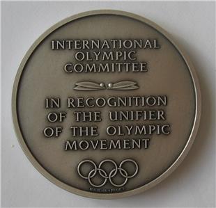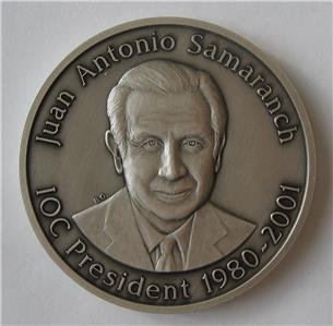 The obverse design shows a bust of Samaranch facing forwards. Around the periphery is the legend "Juan Antonio Samaranch / IOC President 1980 - 2001". The reverse has the Olympic rings near the base, with some laurel leaves above, separating the legends "INTERNATIONAL OLYMPIC COMMITTEE" and "IN RECOGNITION OF THE UNIFIER OF THE OLYMPIC MOVEMENT". The medallists' names "HUGUENIN + KRAMER" are in small script at the base.