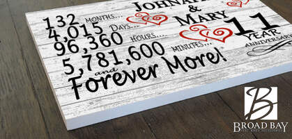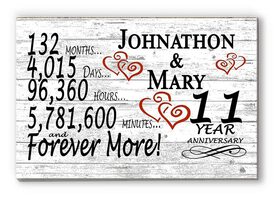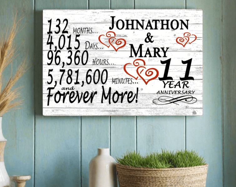 Eleven years of love, commitment, and a bond that only grows more beautiful with time. Celebrate this milestone with a personalized wood sign handcrafted from solid wood in Virginia β custom printed with both names and a romantic countdown of every month, day, hour, and minute together.