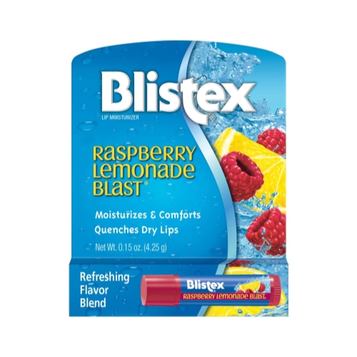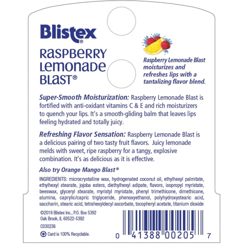 Blistex Raspberry Lemonade Blast moisturizes, protects and refreshes lips with a tantalizing fruit blend. Super-Smooth Moisturization: Raspberry Lemonade Blast is fortified with anti-oxidant vitamins C & E and rich moisturizers to quench your lips. It's a smooth-gliding balm that leaves your lips feeling protected and totally juicy. Refreshing Flavor Sensation: Raspberry Lemonade Blast is a mouthwatering combination of two tasty fruit flavors. Luscious raspberries and sweet lemonade deliver an explosion of flavor. It's as delicious as it is effective. Sun Protection/Sun Alert: Raspberry Lemonade Blast provides SPF 15 protection. Limiting sun exposure, wearing protective clothing, and using sunscreens may reduce the risks of skin aging, skin cancer and other harmful effects of the sun. Card is 100% Recyclable.