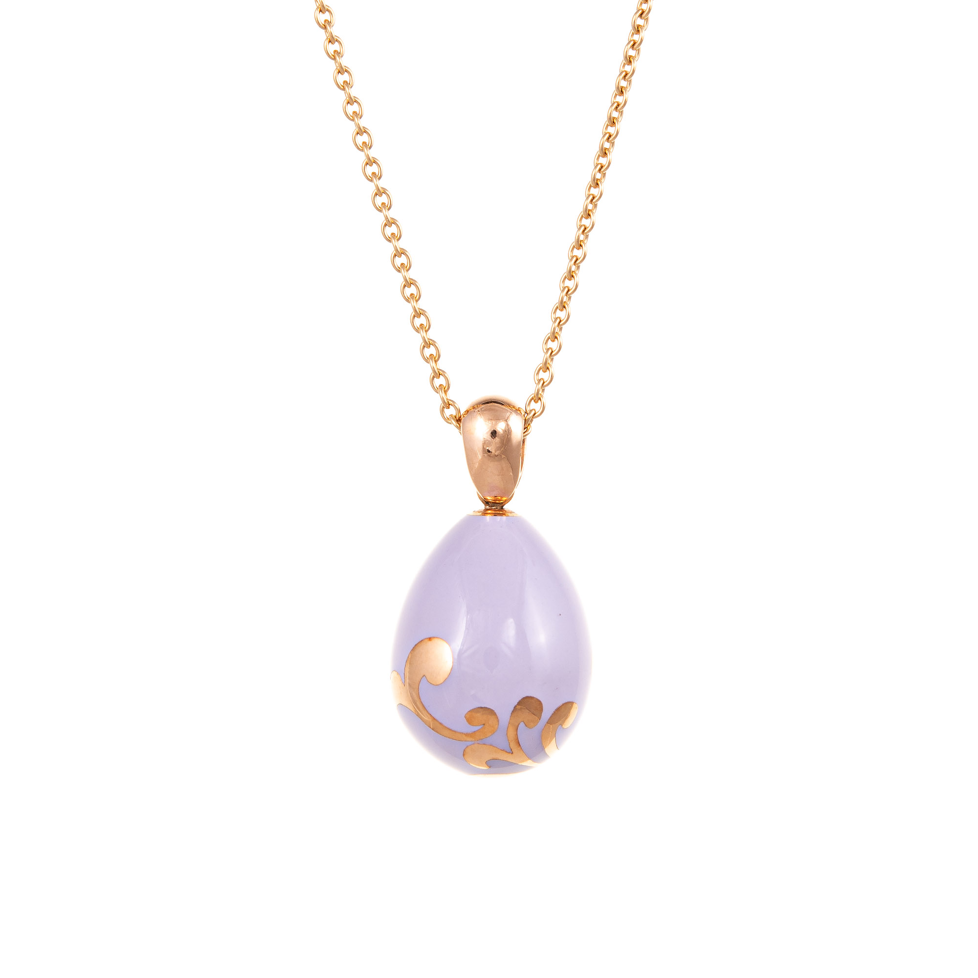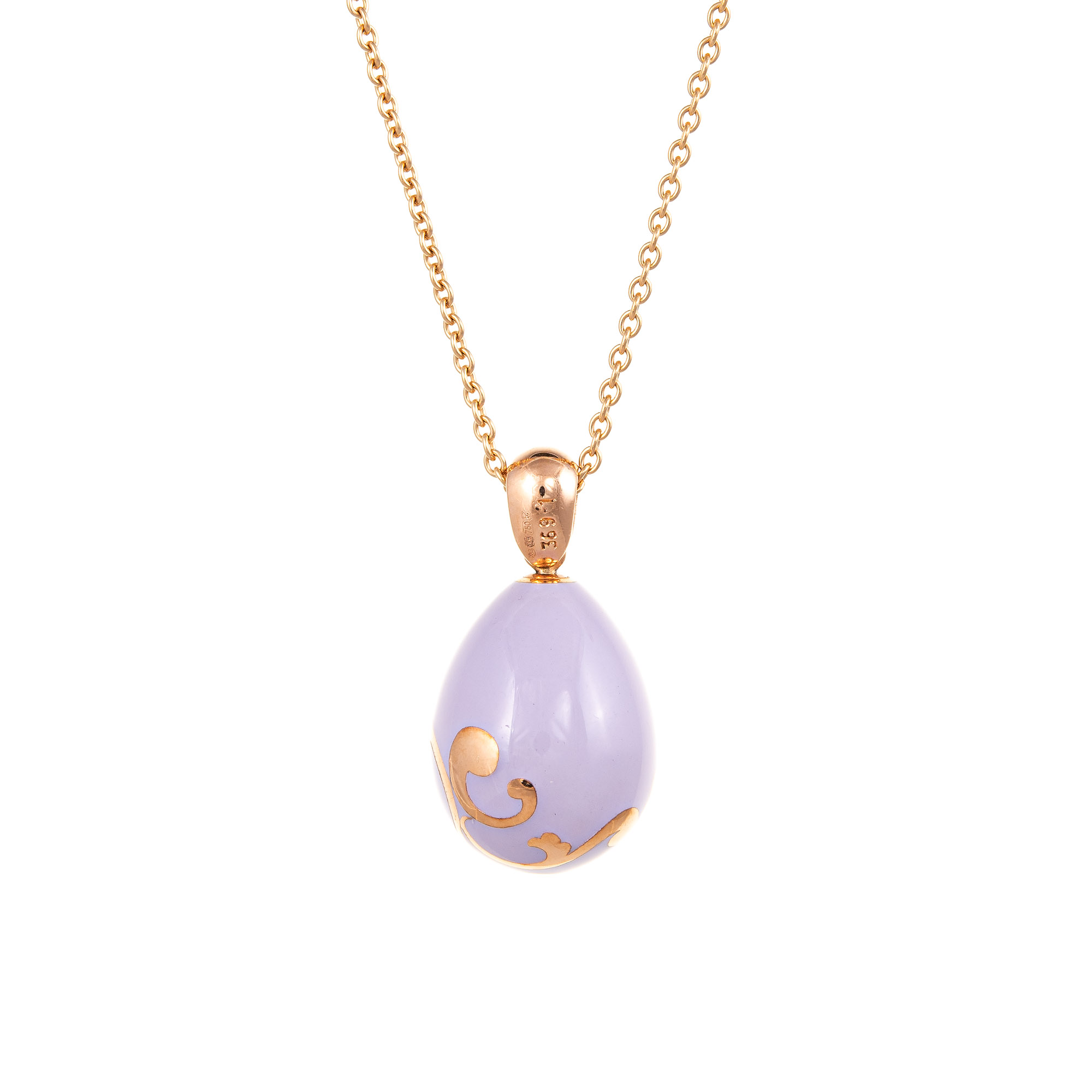 From the Heritage Collection the egg draws inspiration from Faberge's original jeweled masterpieces. The lilac hued enameled egg features a scrolled foliate design. The necklace is a retired piece and no longer available for sale at Faberge.