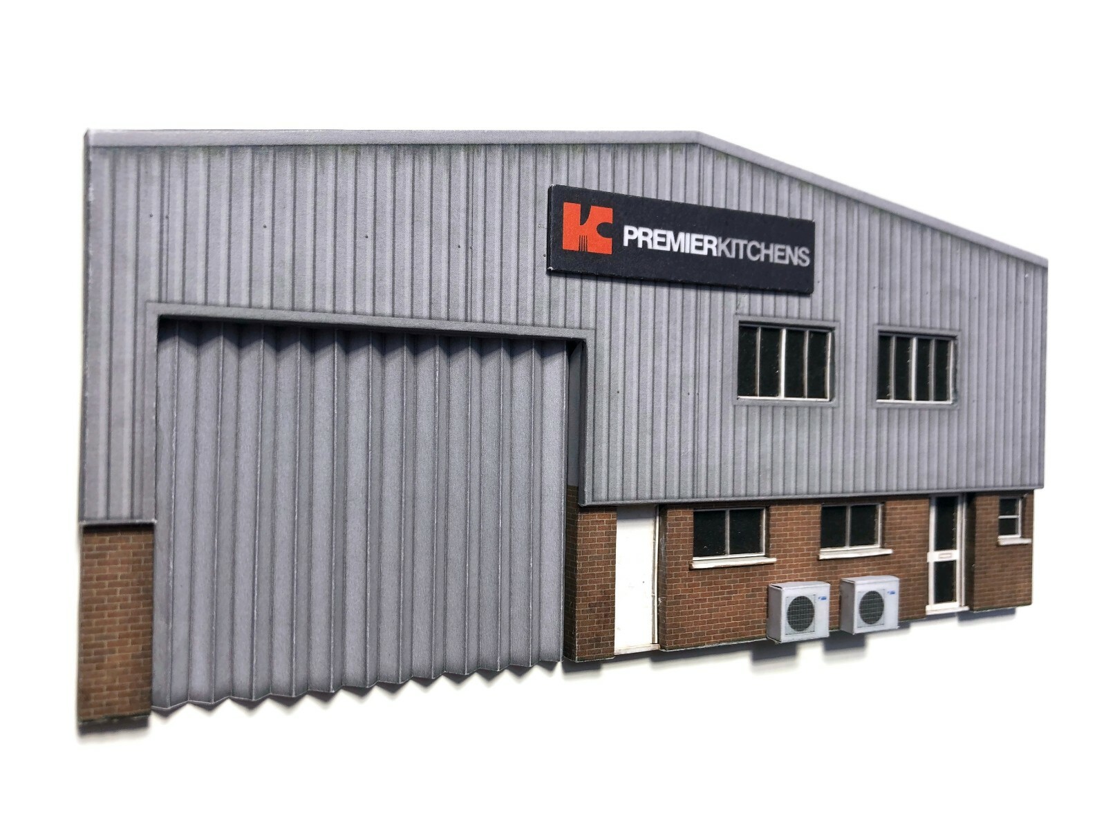 The kit is easy to assemble and uses high resolution, pre-weathered photo-realistic paper texture wraps (require cutting out with a craft knife) over a series of laser cut MDF layers which leave no unsightly visible when construction is complete. This industrial unit has been designed to take up the minimum space possible up against your backscene, but create maximum impact. At just 7mm deep it takes up virtually no space at all, yet is packed with tons of three dimensional detail including true to scale windows & doors, separately applied air conditioning units, a choice of warehouse door and a selection of company signs too!