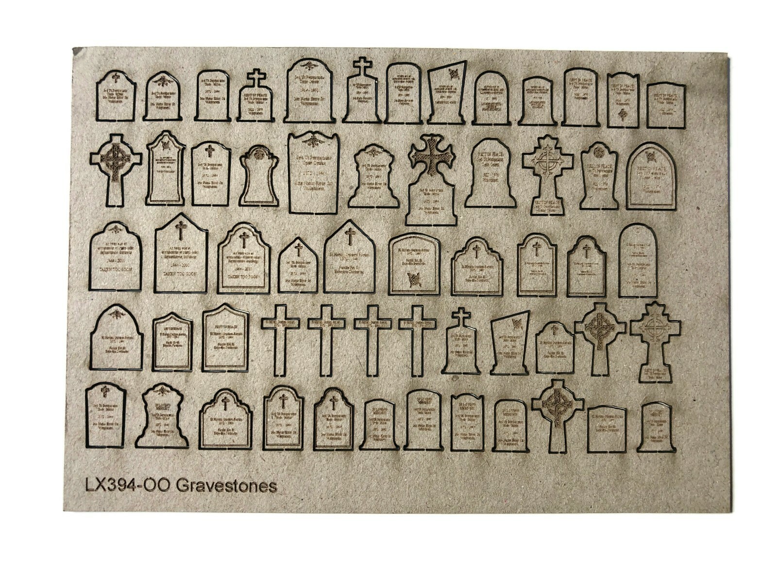 A pack of 58 laser cut & engraved OO gauge / 1:76 scale gravestones for detailing model graveyards & churchyards.