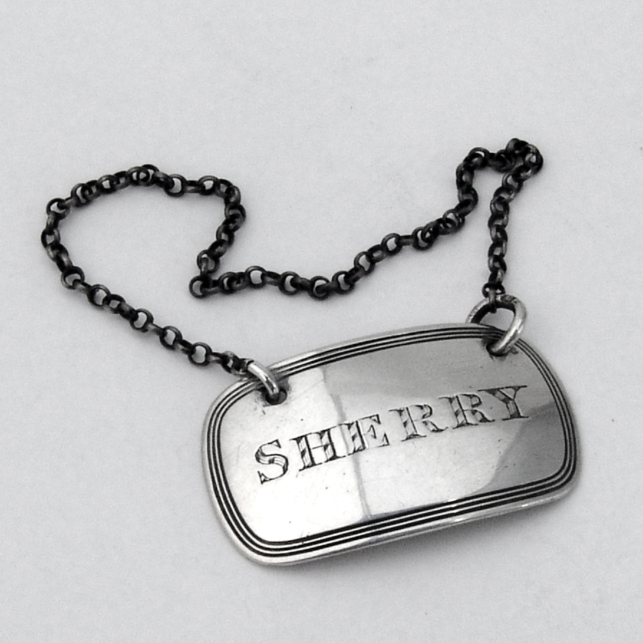 William IV era English sterling silver Sherry bottle tag or label, having oval form with banded border. Made by Joseph Willmore of Birmingham in 1833.