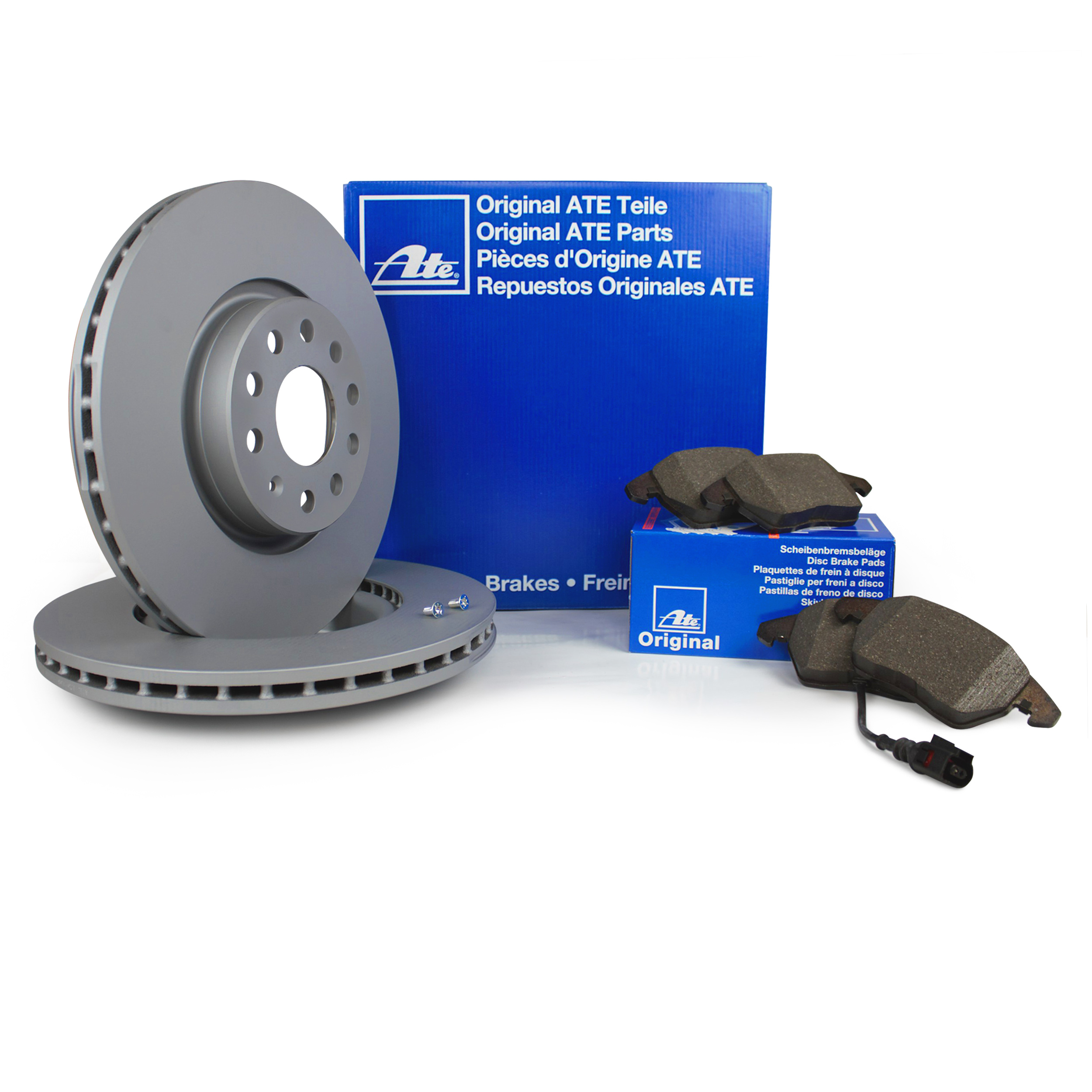 Original ATE Bremsen Set für vorne 2 Bremsscheiben Ø 280 mm + 4 Bremsbeläge inkl. Verschleisskontakt
