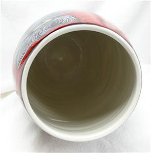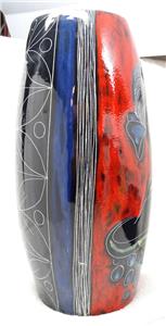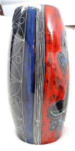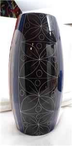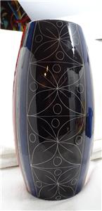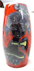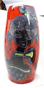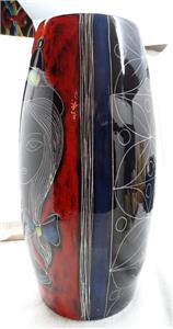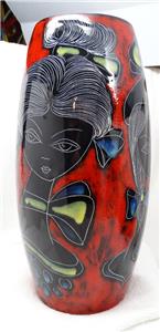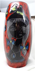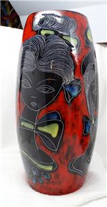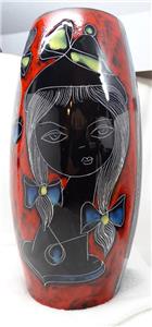 Rare & very cool vintage mid-century vase, primary colors red & black with well detailed images of girls w/ abstract floral décor. Measures 12”. Excellent condition.
