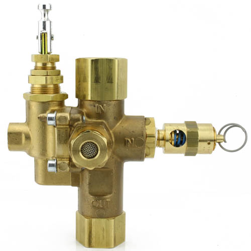 Aftermarket Pilot Unloader Check Valve for Ingersoll Rand. This in-line piloted unloader check valve combination with relief valve, part number: 49816283-C. This is a solid brass valve that is manufactured by Conrader in the USA. This combination valve has a 5/8" inverted flare inlet on the top where your main line from the compressor pump comes in. The bottom port on the valve is a 1/2" female NPT that connects to your existing fitting (commonly has a relief valve in the side) to attach to the tank. This valve comes equipped with a 325 PSI relief valve and a 1/8" female NPT port to install a throttle control valve that is factory set to kick on at 145 PSI and shut off at 175 PSI.