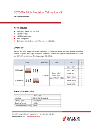 Saluki's S0T306N-F series mechanical calibration kit contains precision standard devices to calibrate network analyzers in the Type-N interface. This series contains the separate calibration kit S0T306N-F and S0T306N-M to choose. The frequency is DC - 6GHz.
