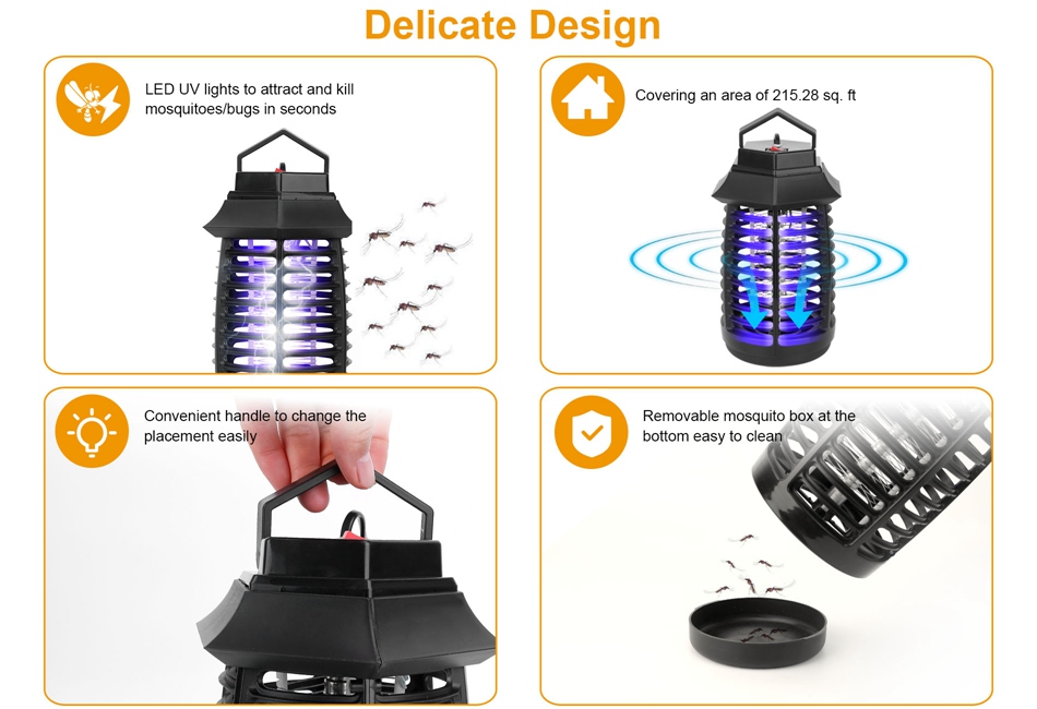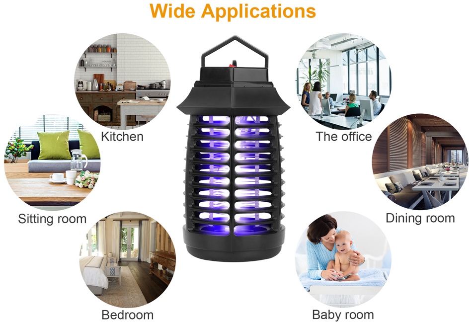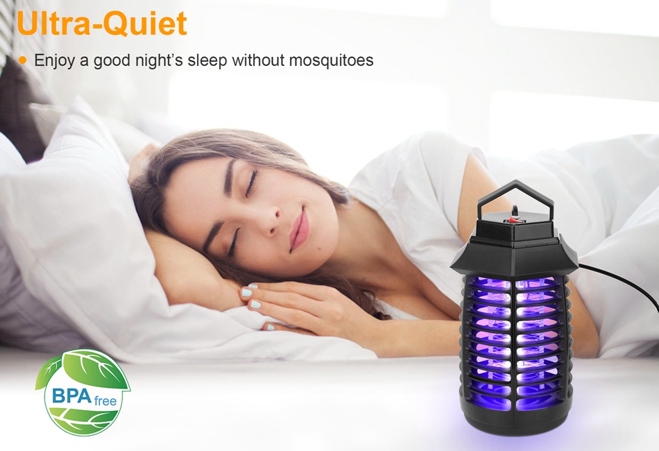 Electric LED UV Mosquito Killer Lamp Pest Fly Bug Insect Repellent Zapper Trap Product Detail Image GalleryProduct DescriptionOverview:Our electric mosquito killer lamp with UV LED can be placed in a standing position or hung from a balcony or ceiling, zapping mosquitoes up to 215.28 sq.ft. The 0.3-inch external protective grid can protect children and pets from high-voltage electric shock, ensuring safety. It is only 0.73lbs, lightweight enough and easy to be carried to outdoor with a handle, such as stairs, camping tents, hiking, fishing, climbing and so on. Features:- EFFECTIVE INSECT KILLER:Lure mosquitoes by UV light and kills them instantly via high voltage grid especially for the incoming of hot summer. Highly effective to kill mosquitoes,fruit flies,moths and other flying bugs. Optimal solutions for protecting your family from annoying mosquito buzz and biting.