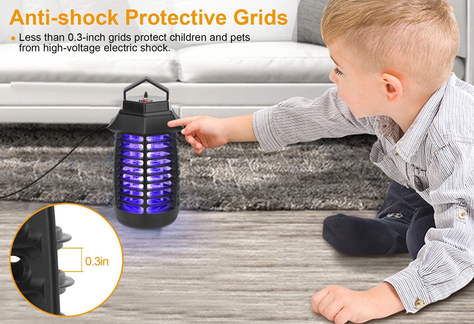 - NARROW GAP & LOW NOISE:For safety,the .3-inch external protective grid can ensure that your fingers will not touch the internal high-voltage power grid,which protects children and pets from high-voltage electric shock. Indoor UV mosquito killer is also relatively quiet,thereby ensuring a good night’s sleep.