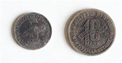 3rd Reich, Getto Litzmannstadt, 5 + 10 Mark Receipt 1943, the Oldest of the Jews, usual weaknesses in embossing, corrosion stains and coating !
