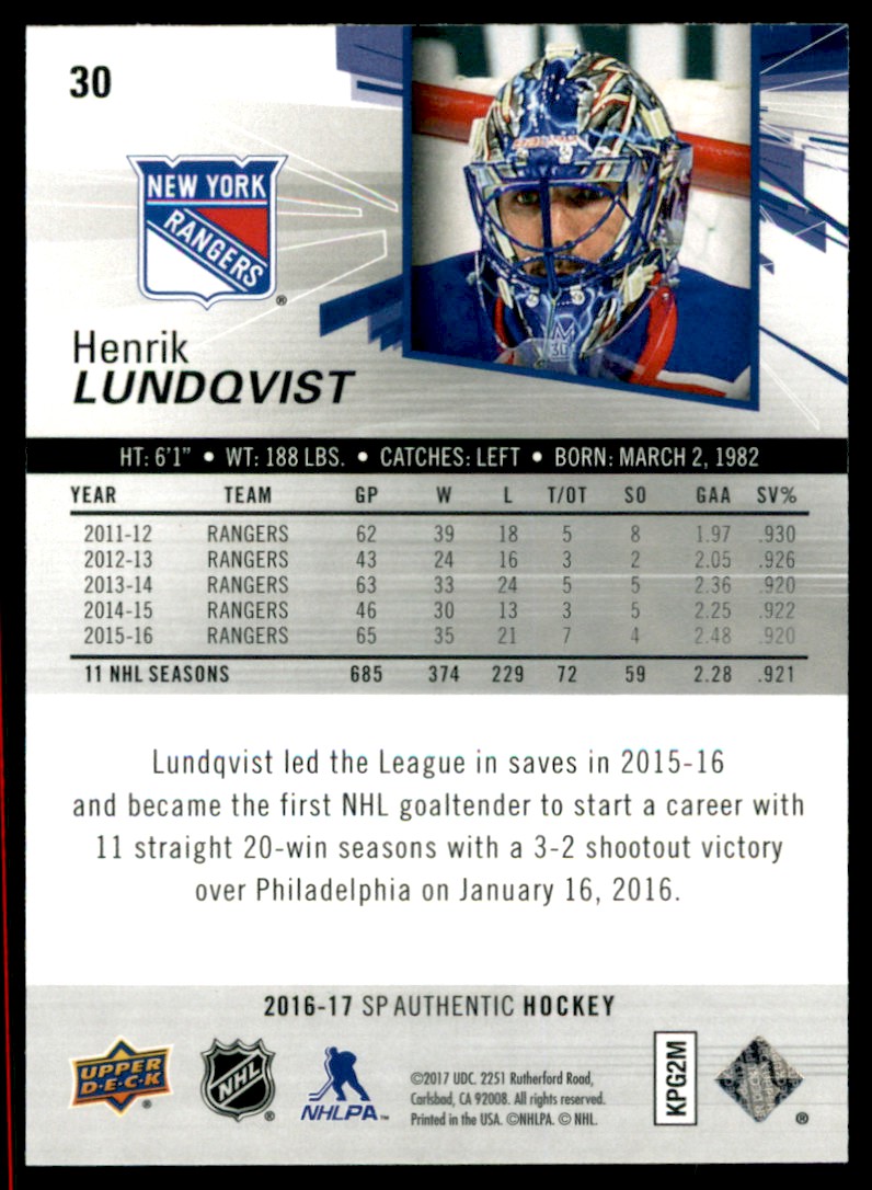| 2017-18 Upper Deck Tim Hortons 30 Henrik Lundqvist | ||||||||||||||||