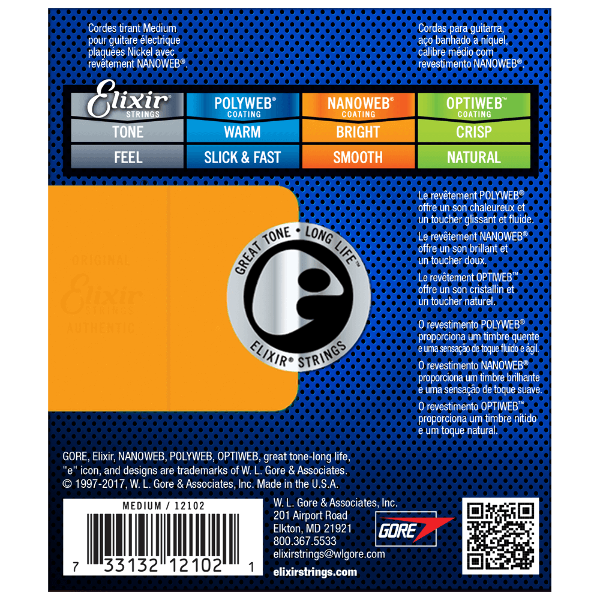 Elixir Strings deliver the presence, punch, and detail of traditional electric guitar strings. But when it comes to tone life, there is no comparison. Players report with Elixir Strings their tone lasts longer than any other string, uncoated or coated. Nanoweb coated wound strings and rust resistant steel strings. #12102