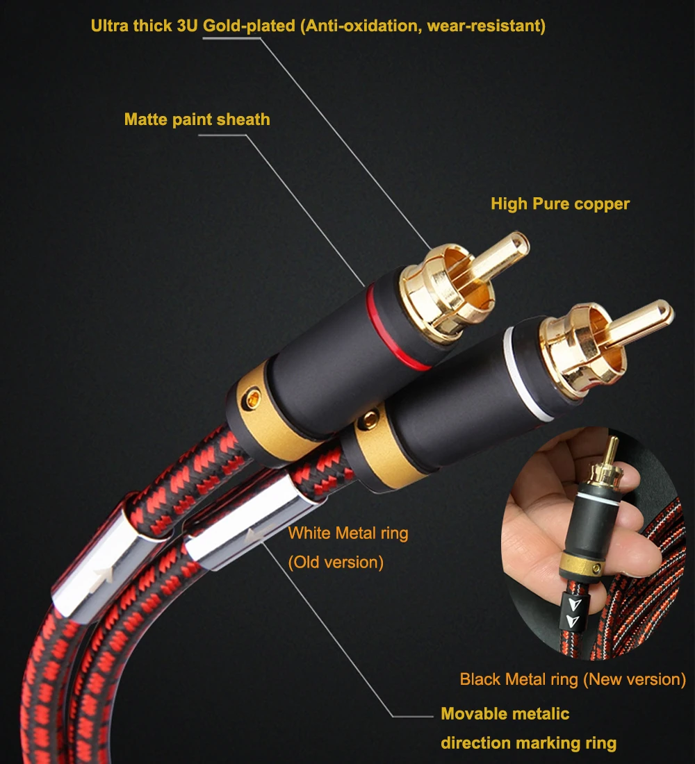 5.With two moveable Black metal ring with arrow mark, easy to distinguish the direction of input and output(CD to Amplifier), Red/white color-marked connectors for quick, easy left-and-right hookups.Note: white metal ring in pictures is old version, we default ship with Black metal ring(new version).