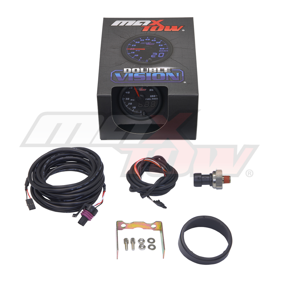 MaxTows Black & Blue 100 PSI Fuel Pressure Gauge is an electronically driven truck gauge that reads and displays your trucks fuel pressure levels from 0 to 100 PSI with unrivaled accuracy. This gauge helps you ensure that your fuel systems pressure is running at optimal levels, and is not too low which could result in loss of horsepower or damage to the fuel pump or injectors. Additional parts required for installation are covered with accessories including a sensor, wiring harnesses and mounting hardware. Youll also receive Installation Instructions, Free Lifetime Tech Support and a One-Year Limited Warranty. Get ready to hit the road and Tow to the Max!