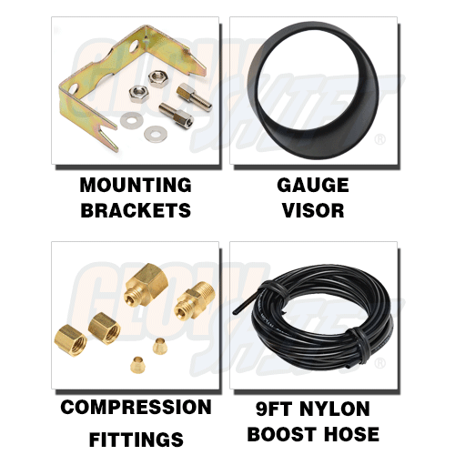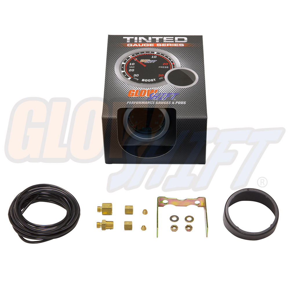GlowShifts Tinted Series 35 PSI Boost Gauge is essential for anyone that has a turbo or supercharger installed in their vehicle, and is running lower boost pressure without the need to monitor vacuum compression levels. This mechanically operated turbo boost gauge will display your car or trucks boost levels from 0 to 35 PSI, helping you guard against overboosting or underboosting which could cause significant engine damage. Parts required for installation are covered with accessories including 1/8-27 NPT Compression Fittings with 9' Nylon Boost Hose in addition to Mounting Hardware.