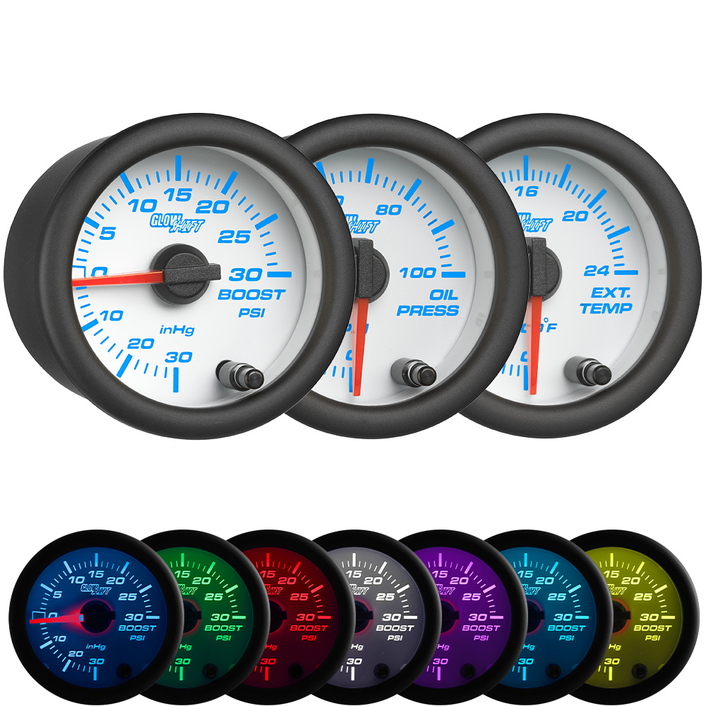 Each of our skillfully designed glow gauges are produced with their own set of abilities and features geared towards offering the car enthusiast the most reliable set of information available. Our gauges feature ground breaking seven color illumination technology offered in several unique styles with Black, White, and Tinted face models. All of the designs include a selection of the most popular instruments used today in the tuning market including boost gauges. For those seeking a more advanced unit with high performance features, our Elite Ten Color lineup offers ten color illumination technology along with high and low warnings, a peak recall function and a stepper motor. Our best-selling car gauges and diesel gauges include our boost gauge, wideband gauge, pyrometer gauge, transmission temperature gauge, oil pressure gauge and exhaust temperature gauge.