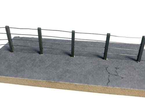 To use: Simply drill a row of 2.5mm holes at approximately 24mm spacing. Paint the fence posts using a slightly thinned concrete grey shade. We recommend thinning the paint to help prevent the pre-drilled holes from blocking during painting. Glue the posts into place, then thread the included wire through the posts and secure with a little glue. The fence posts and wire can then be easily weathered if required using artists acrylics.