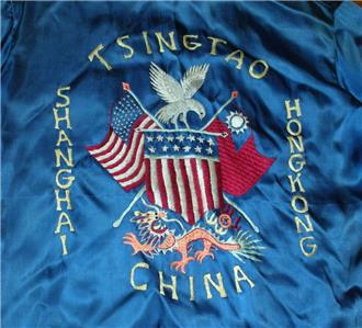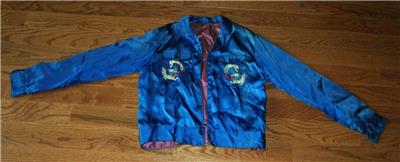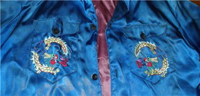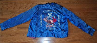 Vintage Unique United States Taiwan Defense Command Silk Embroidered Women's Jacket. It is embroidered with an eagle, dragons crossed American & Taiwan Flags. Chest size - app. 35", sleeve length -23", from collar seam to the bottom of the waistband - app. 22", waist size -35". Size seems to be XS or S (women's). I was told it belonged to a servicewoman but guess could be for a very slim man of small stature. Good condition, light wear, very light fading, missing one button.