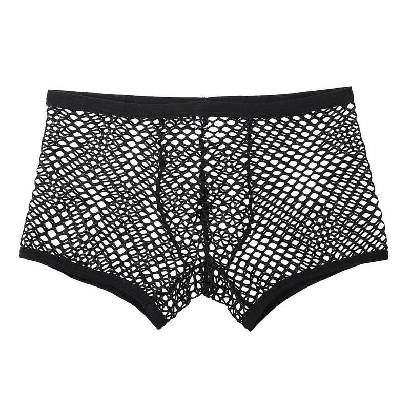 Men’s fishnet boxer briefs underwear, low rise and pull on closure.