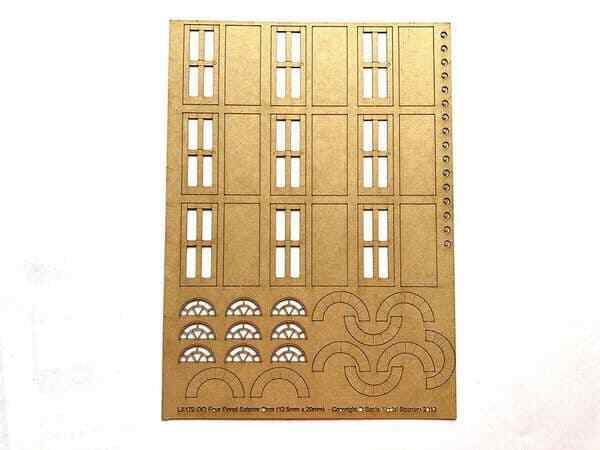 A pack of 9 laser cut & engraved 12.5mm x 29mm four panel exterior style doors complete with header bricks and decorative arched top window. Ideal for scratchbuilding or upgrading existing plastic & card buildings. Easy to assemble with simple, layered construction & even include a door knob!