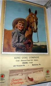 1951 BEAUTIFUL COWGIRL WALL CALLENDAR FOR KING COAL COMPANY PA. It measures 23" 14". Very good unused condition, with a few small edge tears as seen in the photos.. We will mail it rolled.