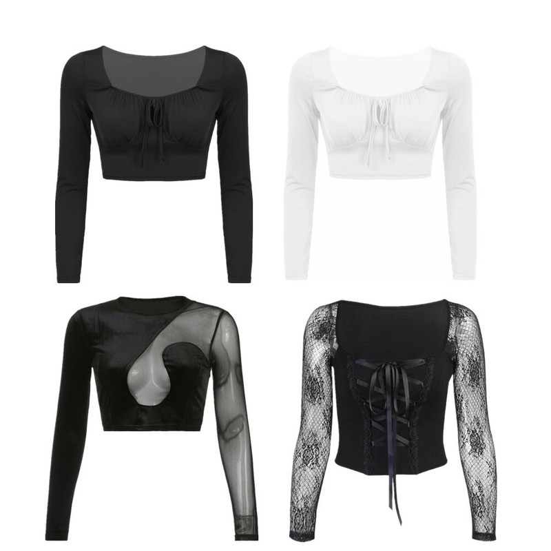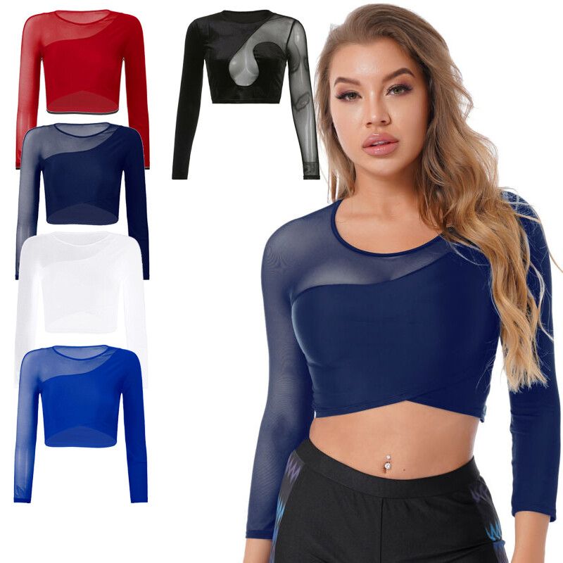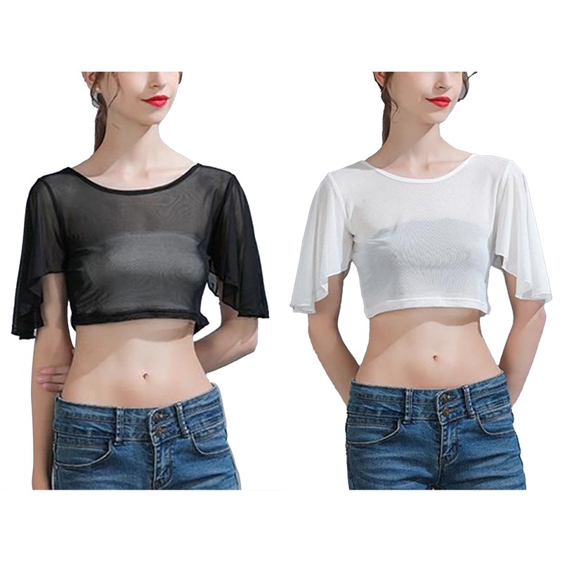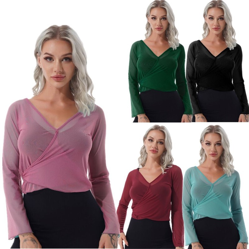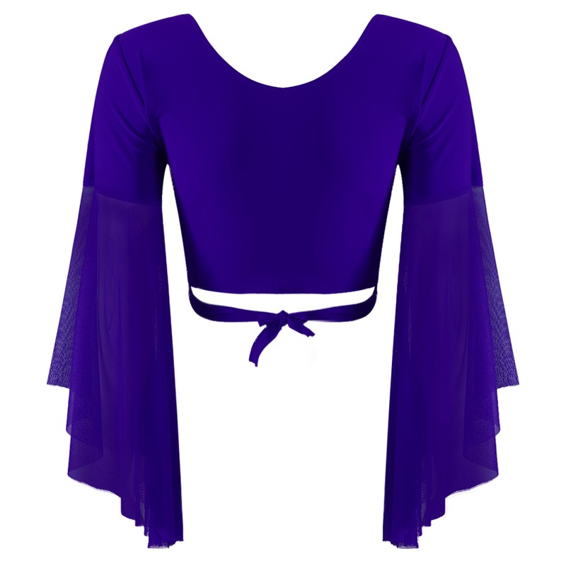 Womens V Neck Lace-up Belly Dance Tops 3/4 Tulle Flared Sleeve Crop Top.