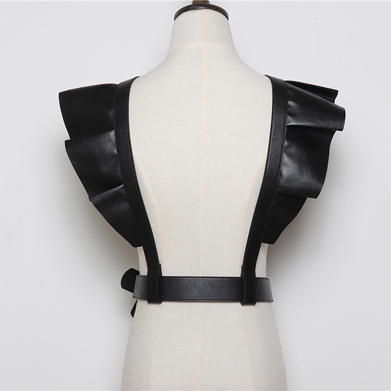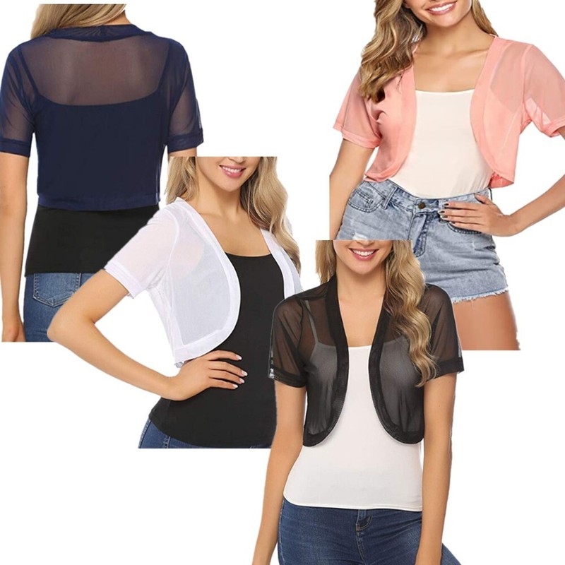 Featuring v neck, lace-up, 3/4 tulle flared sleeve, cropped length.