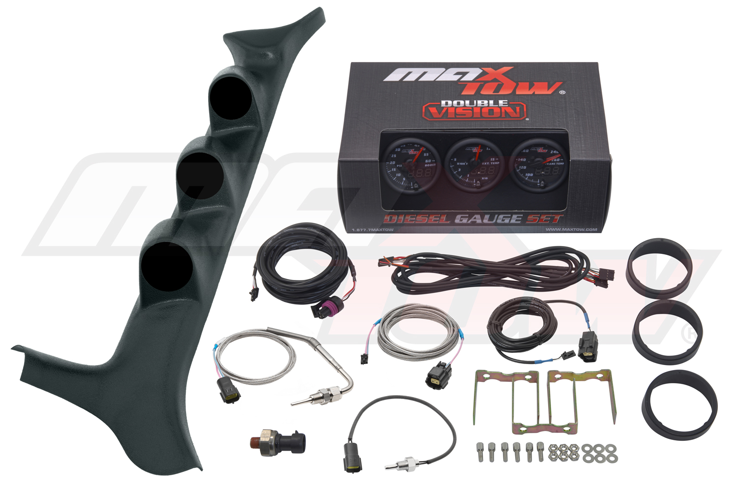 Monitor critical engine systems with the MaxTow Black & Green Double Vision Series Triple Gauge Package for any 1992-1997 OBS Ford F-Series F-150, F-250 or F-350. This custom diesel set comes with (3) 2-1/16 (52mm) gauges including a 60 PSI Boost Pressure Gauge, 1500° Fahrenheit Exhaust Gas Temperature (EGT) Pyrometer Gauge and a Transmission Temperature Gauge. Also featured is a Black Triple Gauge Pillar Pod made specifically for the 7.3L IDI or Power Stroke. To round out this custom gauge package, accessories including sensors, wiring harnesses and hardware are provided for installation. Youll also receive Installation Instructions, Free Lifetime Tech Support and a One-Year Limited Warranty. Get ready to hit the road and Tow to the Max!