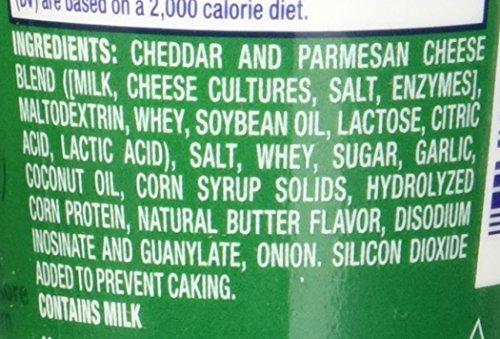 Viva l'Italia! Made with real cheese and garlic, this classic combination packs the taste of Italy in to a convenient jar of Popcorn : Serv. Size: 1/4 tsp. (). Servings per Container: 85, Amount Per Serving: Calories 3, Total Fat 0g (0% DV), Trans Fat 0g, Sodium 100mg (4% DV), Total Carb. 0g (0% DV), Sugars 0g, Protein 0g. Not a significant source of other nutrients. Percent Daily Values are based on a 2,000 calorie diet.
