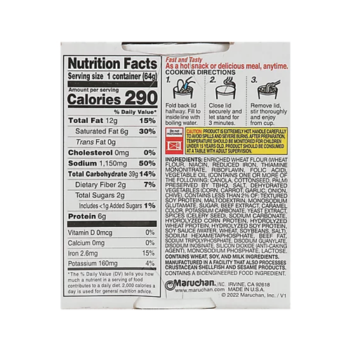 Maruchan Instant Lunch Beef Flavor Ramen Noodle Soup allows you to enjoy a hearty meal just about anytime. It is ready to serve in as little as three minutes and packs a bold flavor. It contains no trans fat or cholesterol. It is an ideal meal for college students, busy moms, and just about anyone who is frequently on the go. Enjoy it as a hot snack or a tasty meal just about anytime.