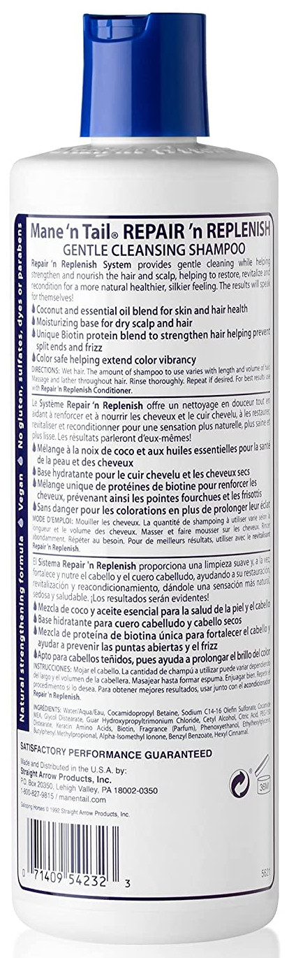 Mane 'n Tail Repair 'n Replenish Shampoo, 11.2 oz. This a natural strengthening vegan shampoo is formulated with coconut oil, for skin and hair health, and biotin protein, for strengthening hair to help prevent split ends and frizz. It provides gentle cleaning while helping strengthen and nourish the hair and scalp, helping to restore, revitalize, and recondition for a more natural, healthier, and silkier feeling. The formula is color safe to help extend color vibrancy.