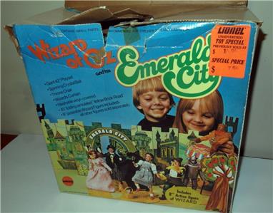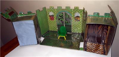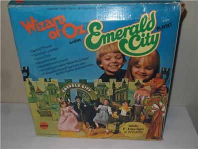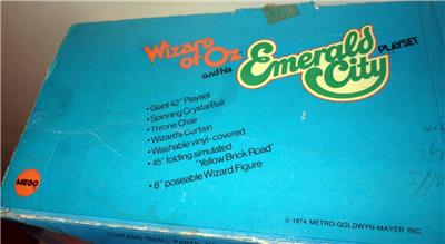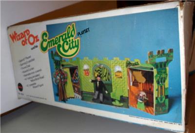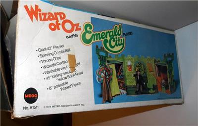 VINTAGE MEGO WIZARD OF OZ EMERALD CITY PLAYSET IN BOX WITH 6 EXTRA FIGURES. The set itself includes a wizard figure almost complete but missing a spinning crystal ball. The outer box is very good but has some wear as seen in the photos.