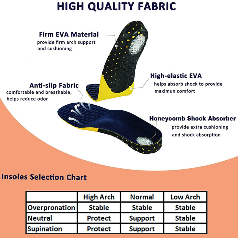 ★[Premium Material and Breathable Lightweight Design]:The Orthotic Insoles is made of comfortable and soft Ultra-fine velvet and high polymer EVA with good elasticity and Skin-friendly fabric The Venting hole design can eliminate odor and suck up all the sweat and keep cool and breathable of your feet. The whole insoles is very lightweight and comfortable .Would be your wise choice of all the orthotic insoles .