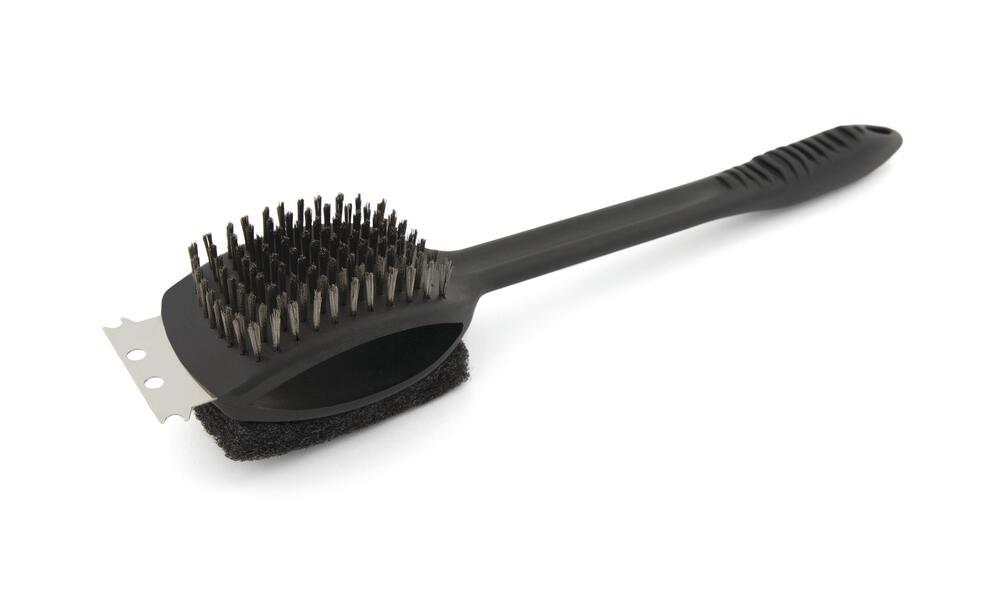 This stainless steel grill brush features a scrubbing pad and scraper.