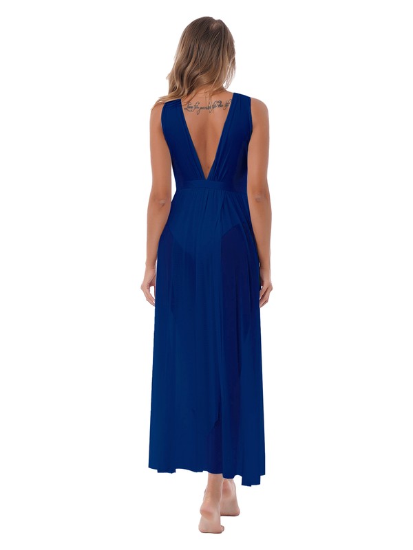 Womens Sheer Mesh Patchwork Split Dance Dress Flower Decor Criss Cross Dresses.
