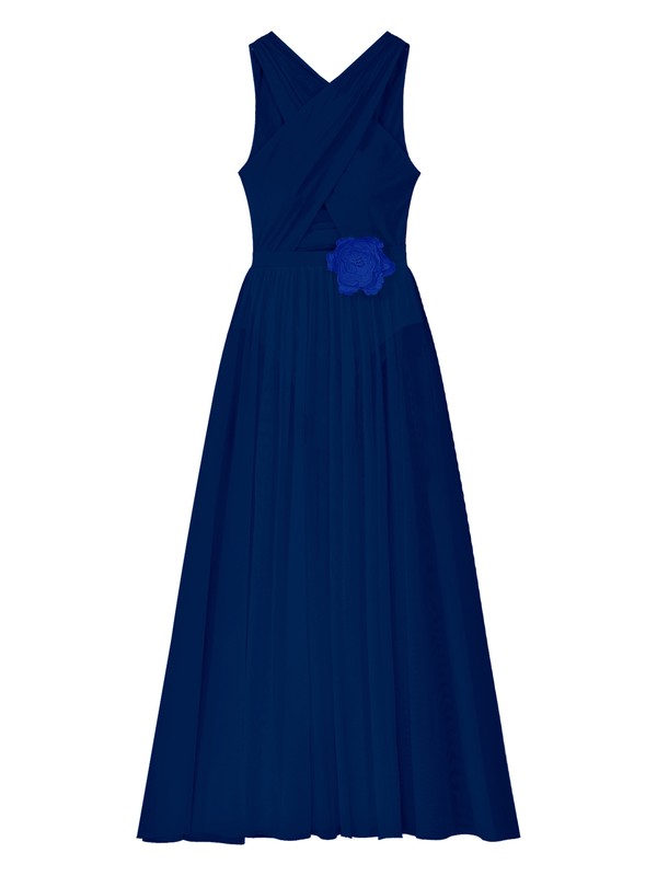Dance dress bodice decorated with glitter sequins, attached mesh maxi skirt with left side slit.