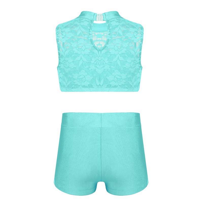 Matching bottoms with wide elastic waistband, triangle lace splice at outside of the leg. Fashionable athletic set for your girl.