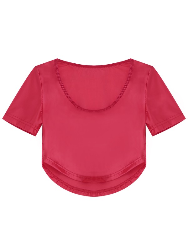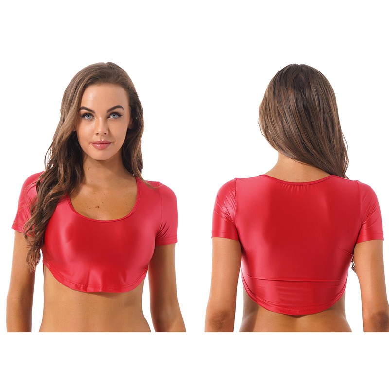 Women Glossy Scoop Neck Curved Hem Crop Top Stretchy Short Sleeve T-shirt.