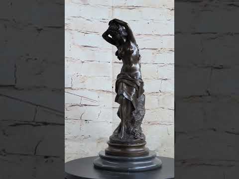 This captivating statue beautifully captures the essence of a nymph in a contemplative moment, basking in the warmth of the sun on a rocky perch. The intricate details reveal a nymph delicately rubbing her hands over her smooth legs, her toes lightly touching the water's edge. The sculptor skillfully conveys a sense of vulnerability as the nymph appears lost in deep thought, perhaps reminiscing about a long-lost love that left her heartbroken and alone.