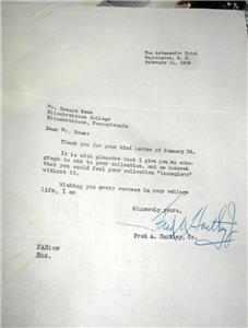 We are selling a collection of autographs of Mr. Donald Ream. He sends hundreds of requests for autographs of famous people in the 1940s and 1950s or asked them to sign in person. We do not have COD for them but at that time people signed and send it back.