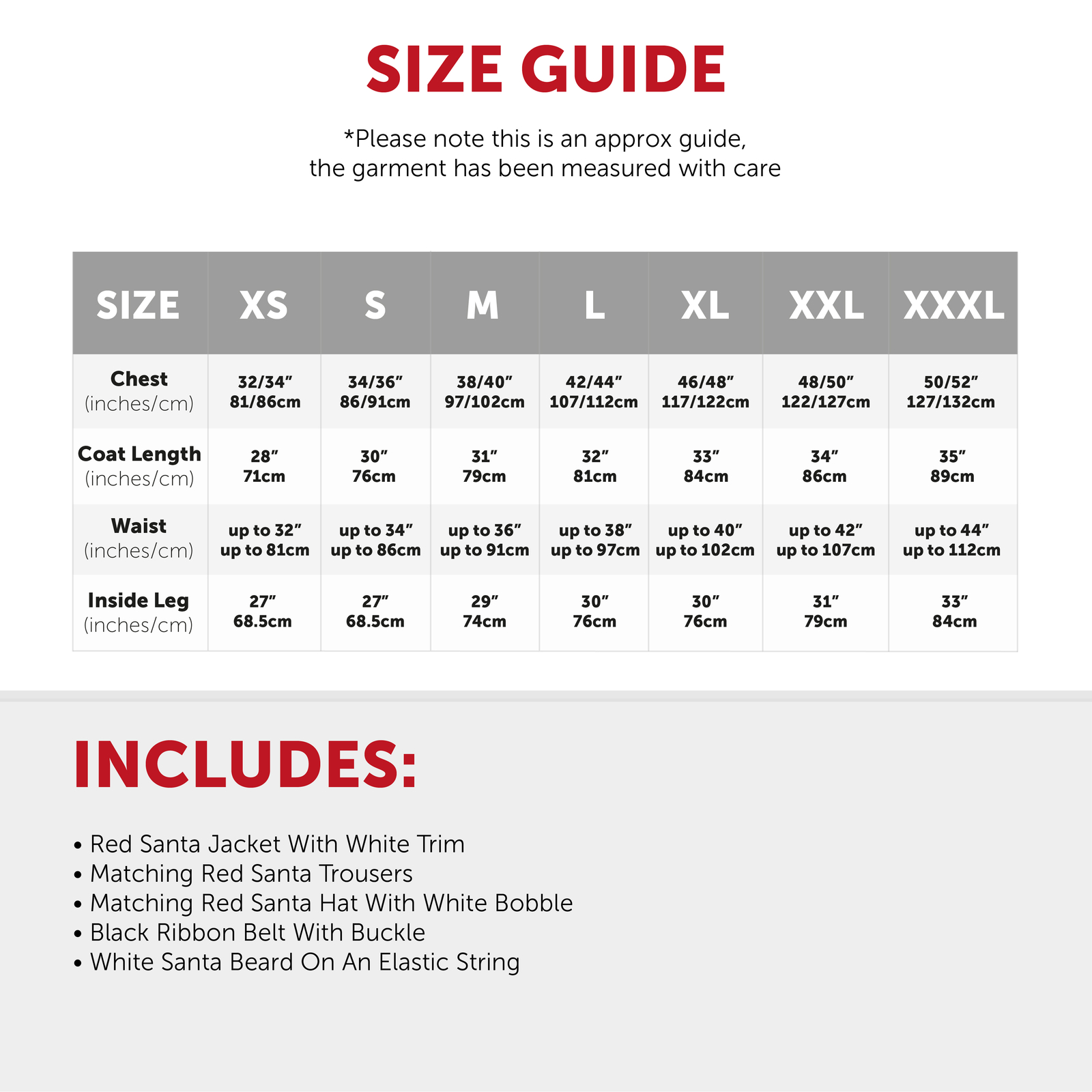 COSTUME INCLUDES: Your 5 Piece Santa Costume includes a Santa Red Jacket and Matching Red Santa Trousers, a Red Santa Hat, a Black Ribbon Belt with Buckle, and a White Santa Beard on an elastic string!