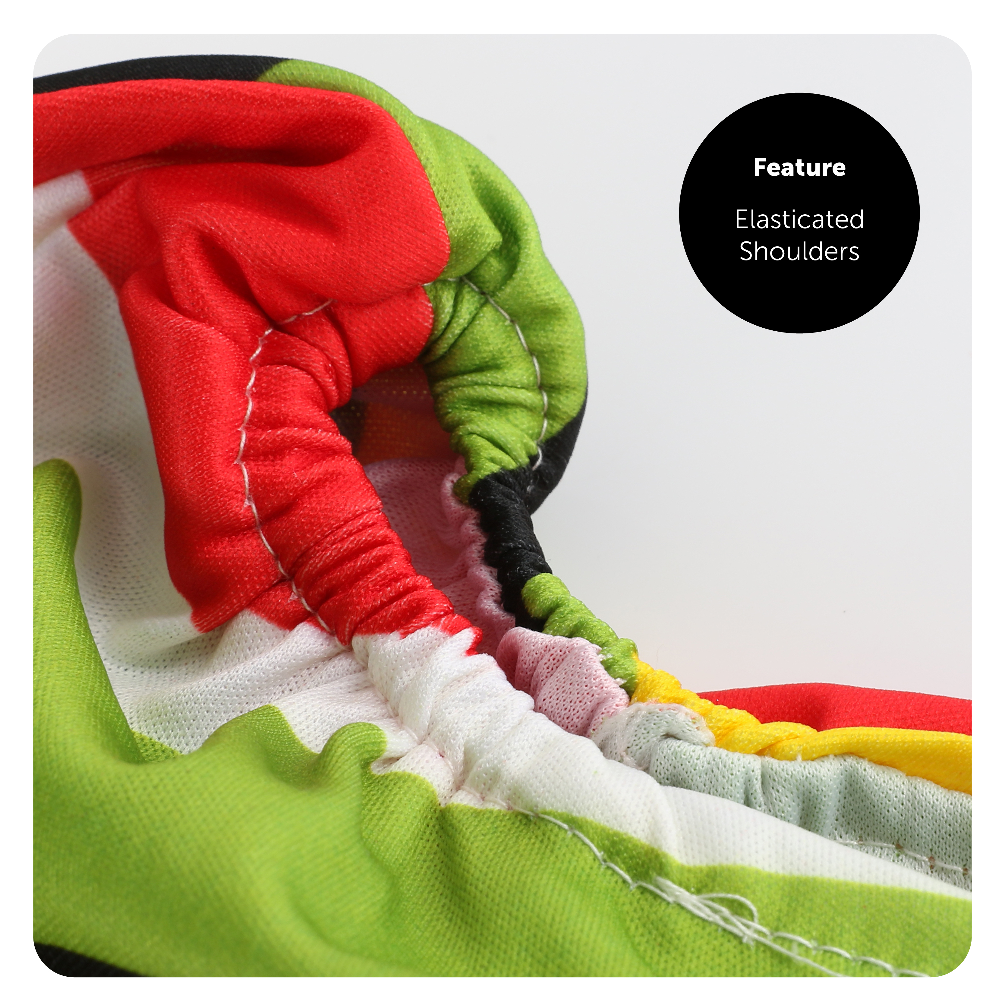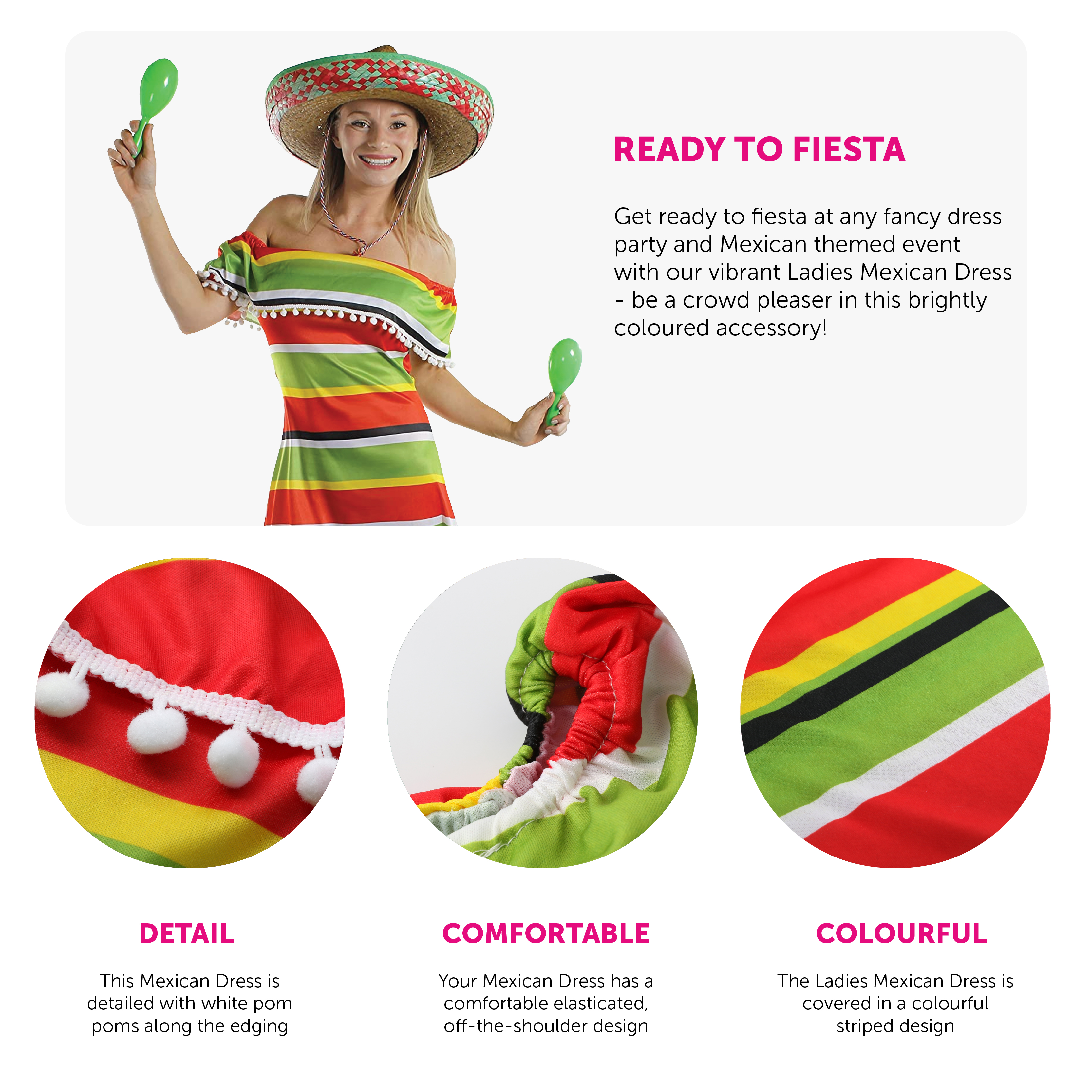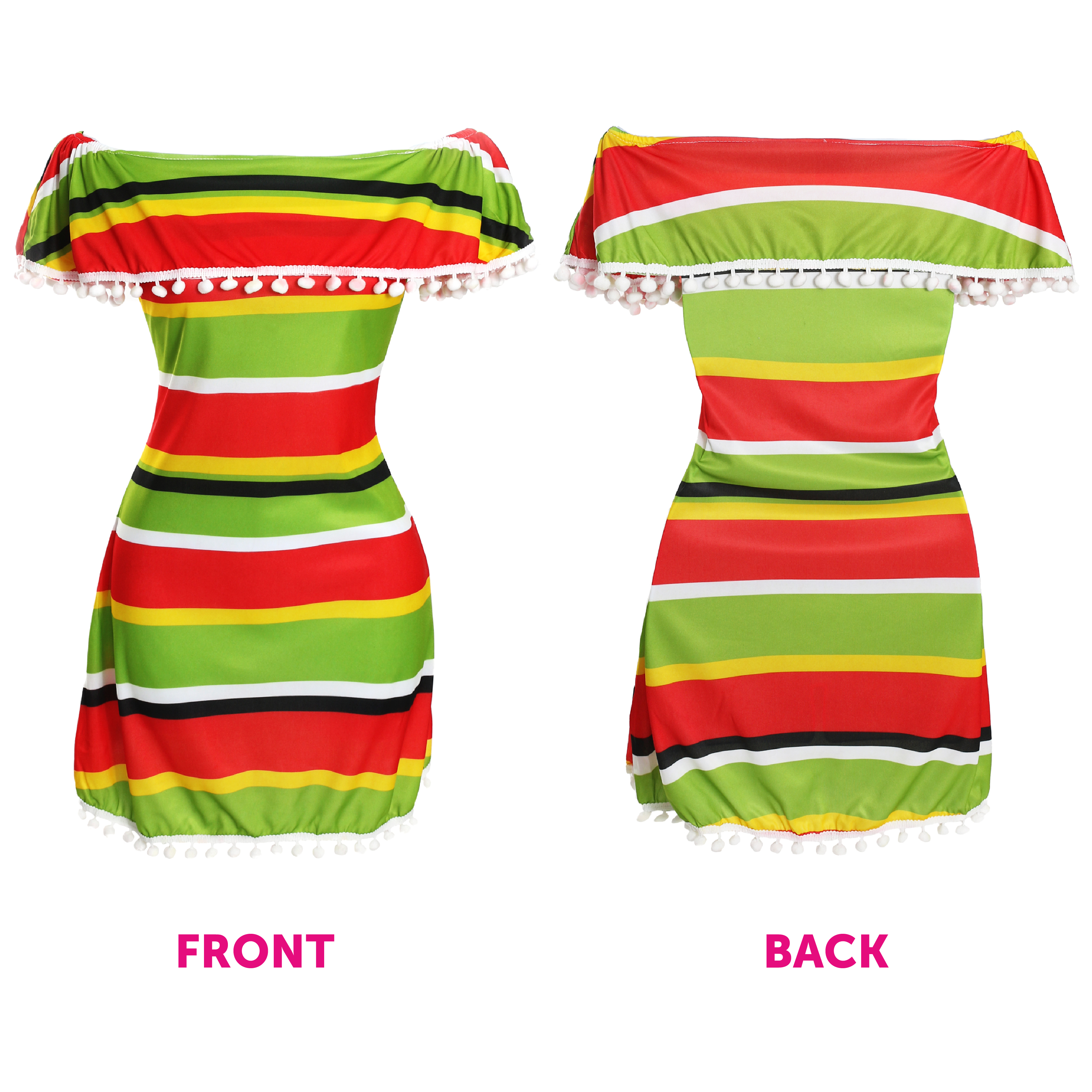 MEXICAN DRESS DETAILS: Your Ladies Mexican Dress is a striped Off-the-Shoulder dress with Pom-Pom layers and edging, with a multicoloured pallet of Green, Red, Yellow, Black, and White to make your dress stand out with style in traditional colours!
