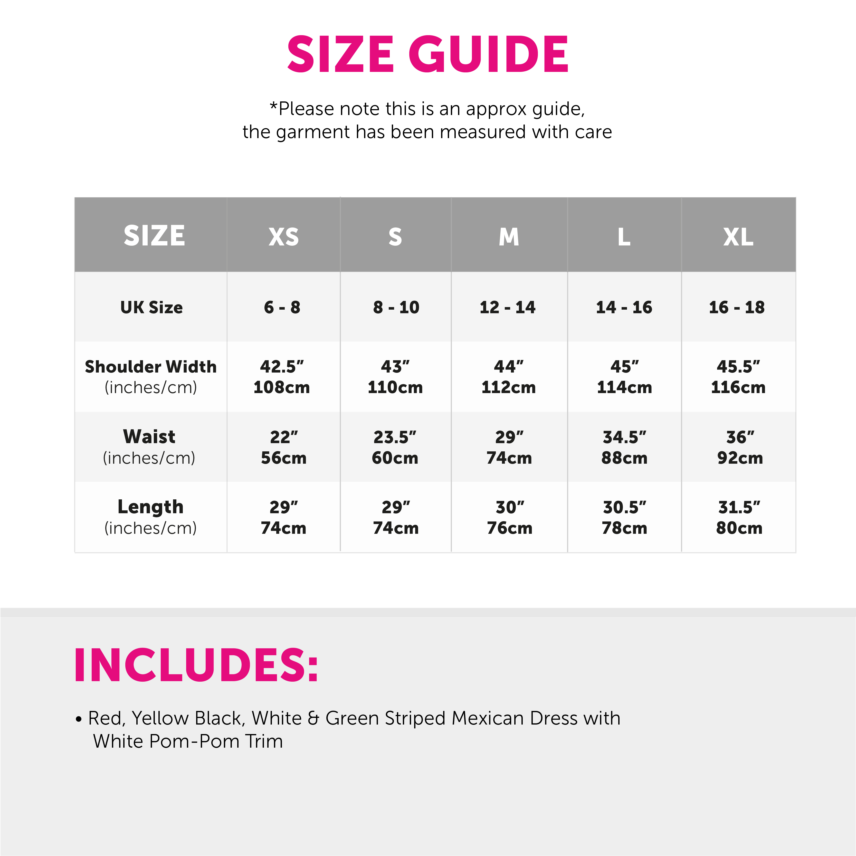 COMPLETE YOUR MEXICAN LOOK: If you’re still looking to upgrade your look with your Mexican Dress, pair your Mexican Dress with a Sombrero and a Pair of Maracas to complete your iconic Mexican Fiesta look!
