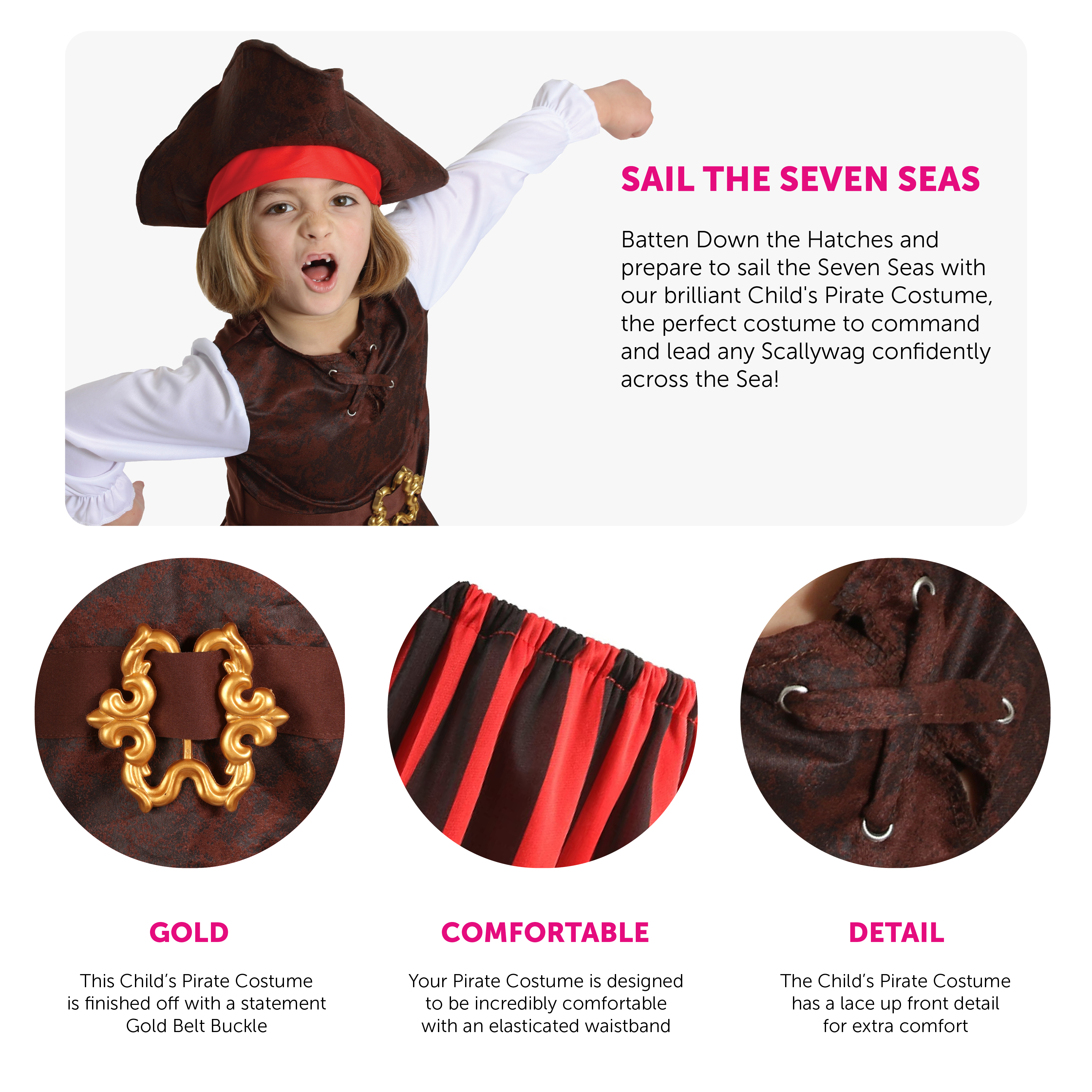 Batten Down the Hatches and prepare to sail the Seven Seas with our brilliant Boys Pirate Fancy Dress Costume, the perfect costume to command and lead any Scallywag confidently across the sea!