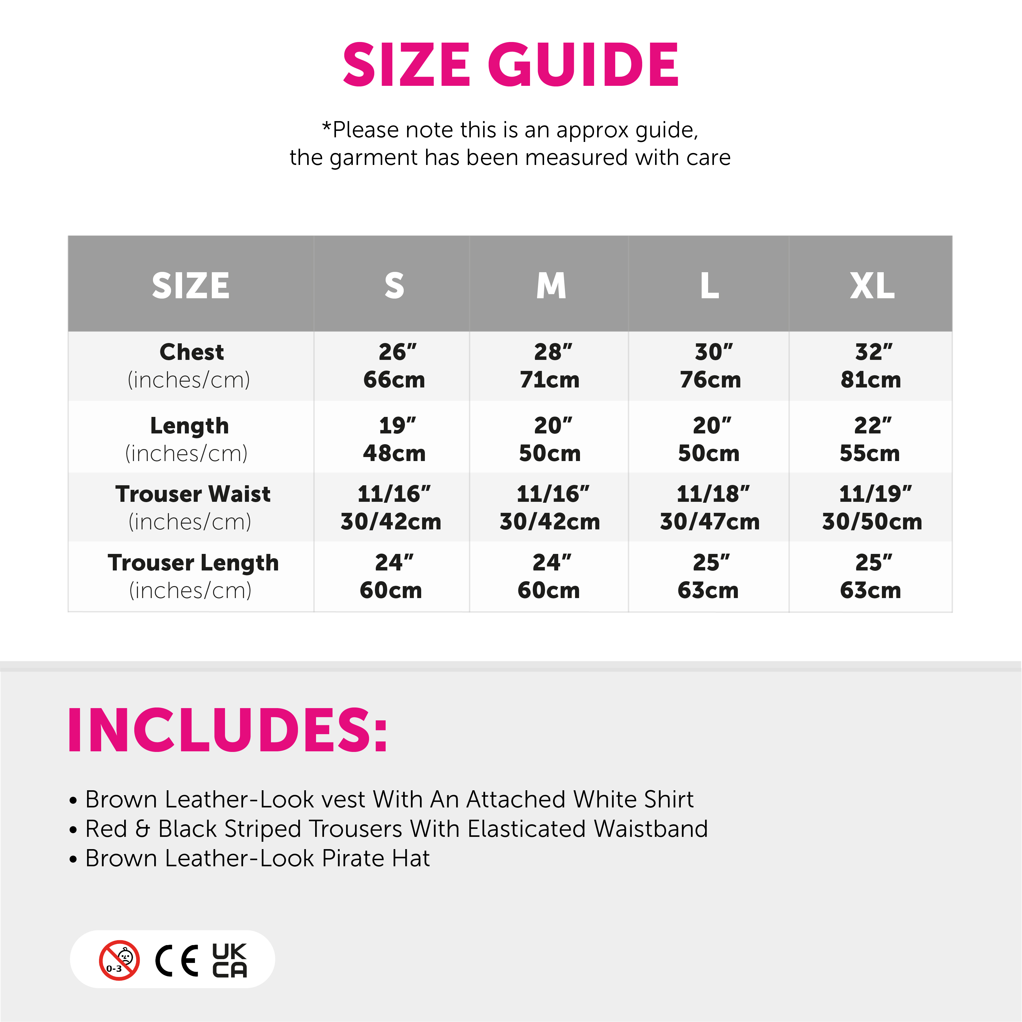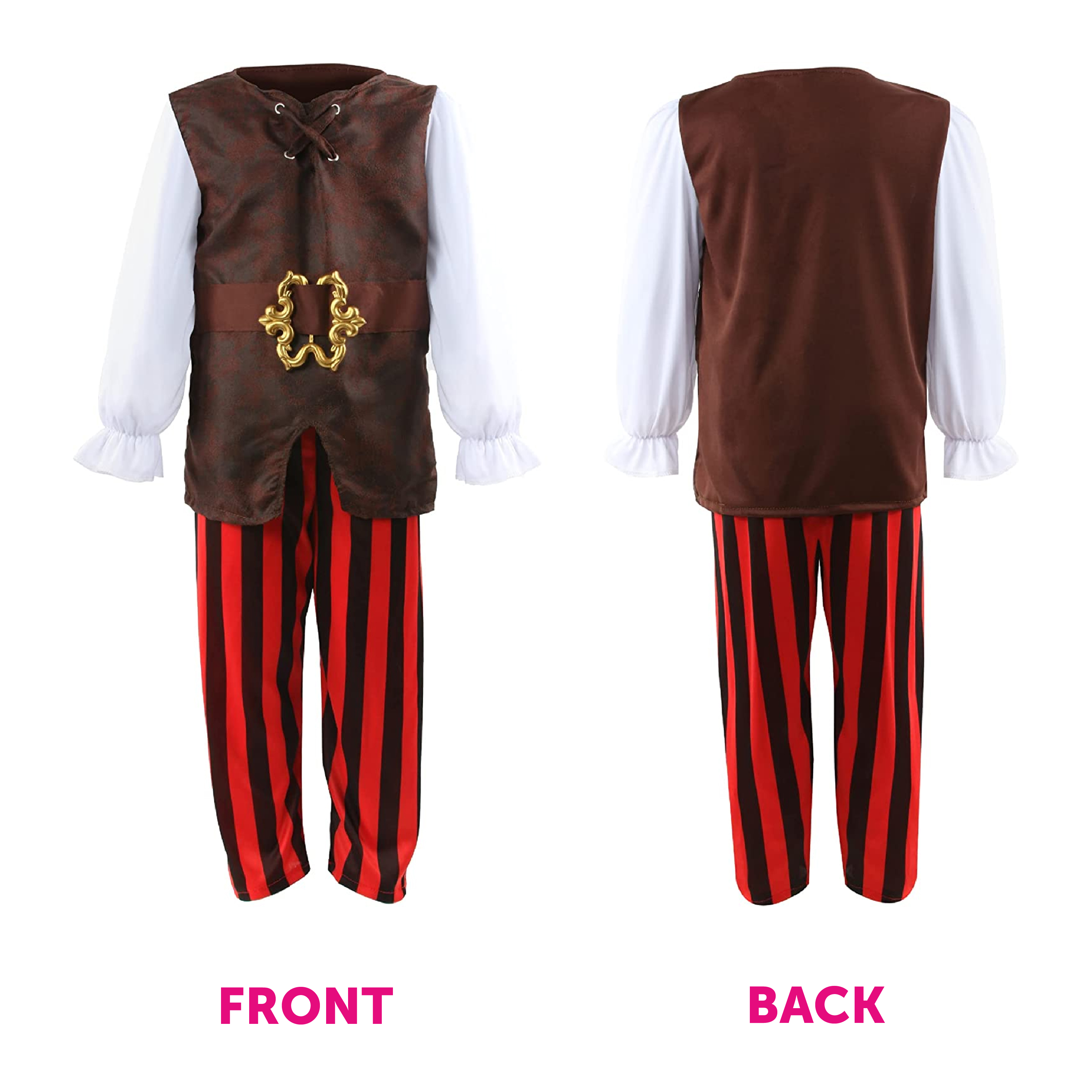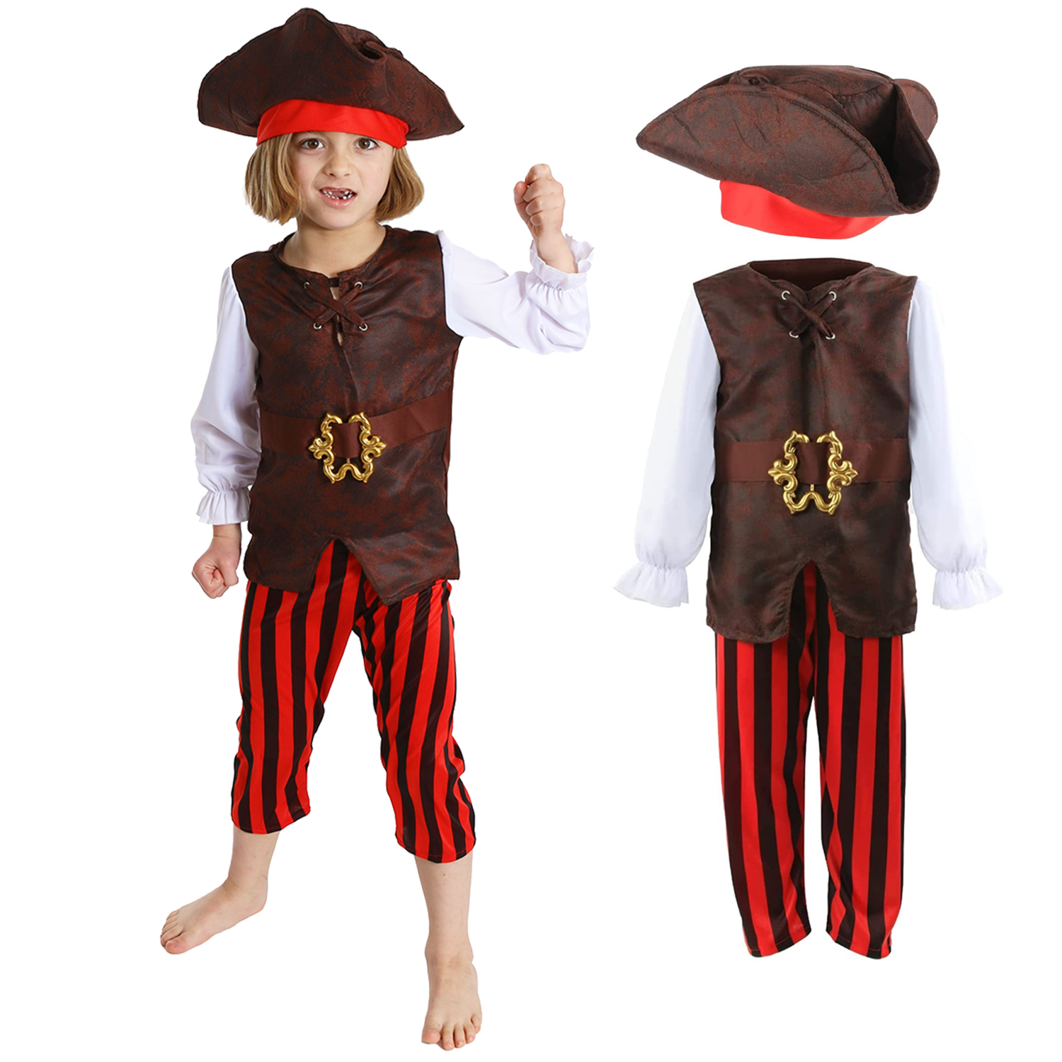 COSTUME INCLUDES: Your Boys Pirate Fancy Dress Costume includes a Brown Leather-Look vest with an Attached White Shirt, Red and Black Striped Trousers, and a Brown Leather-Look Pirate Hat with a Red Band!