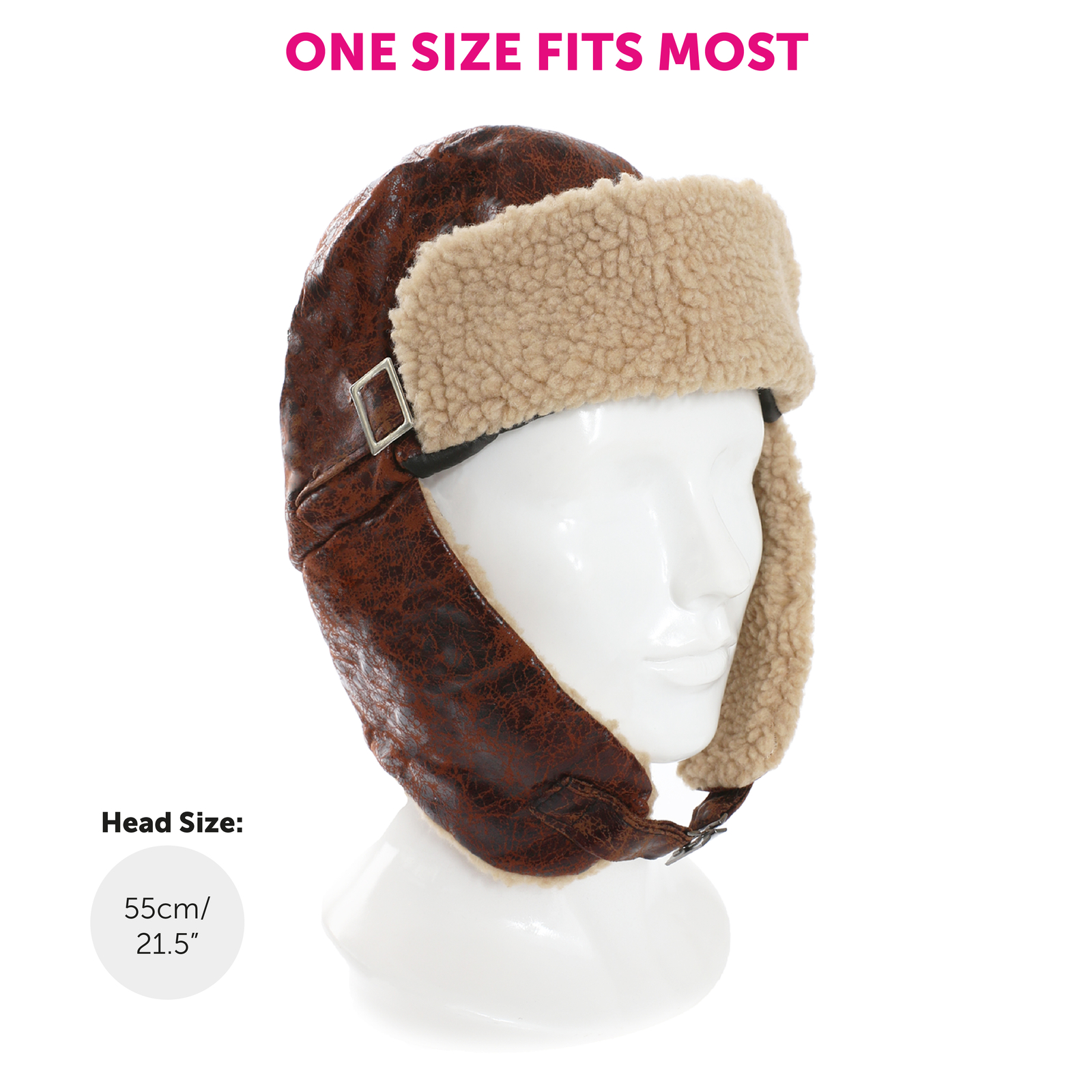 SOFT LEATHER LOOK AVIATOR HAT WITH FAUX FUR UNDER EAR FLAPS AND ON FRONT OF HAT