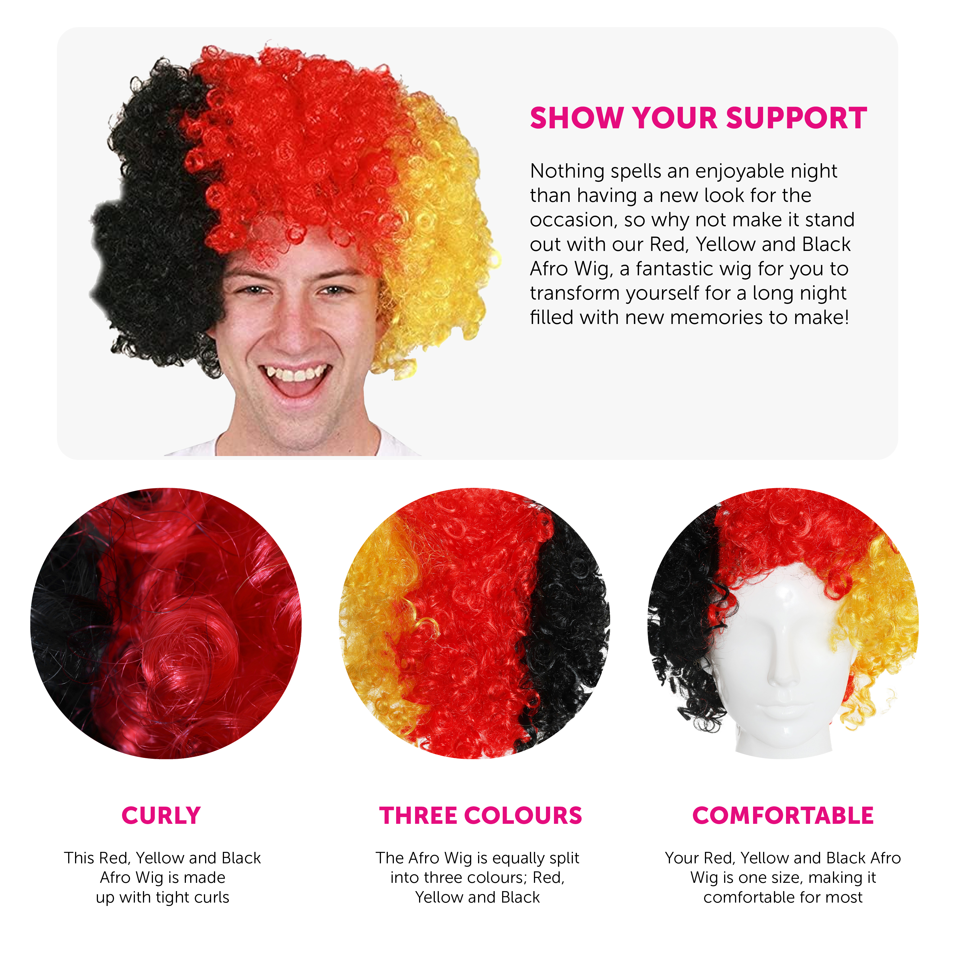 PERFECT FOR GERMAN SPORTING EVENTS & OCCASIONS: Whether it be to support your country at Sporting events, or National Holidays, or to finish off a general Costume, you can be sure to count on our Red, Yellow and Black Afro Wig for making some great memories!