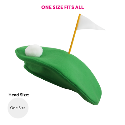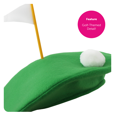 GOLF HAT ACCESSORY DETAILS: With a classic Beret design, the Pom-Pom on top representing a Golf Ball, alongside the Hole Flag, and the Beret itself portraying the Green, a clever and novelty look!